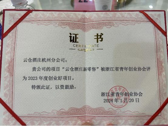 此次年会汇聚了全省的青年创业精英,展示了多个具有创新精神和市场潜力的好创业项目。其中,云仓酒庄杭州分公司的“云仓酒庄新零售”项目,在众多项目中脱颖而出,浙江省青年创业协会评为2023年度创业好项目,并荣获了浙江省青年创业协会第二届理事会理事单位的殊荣。